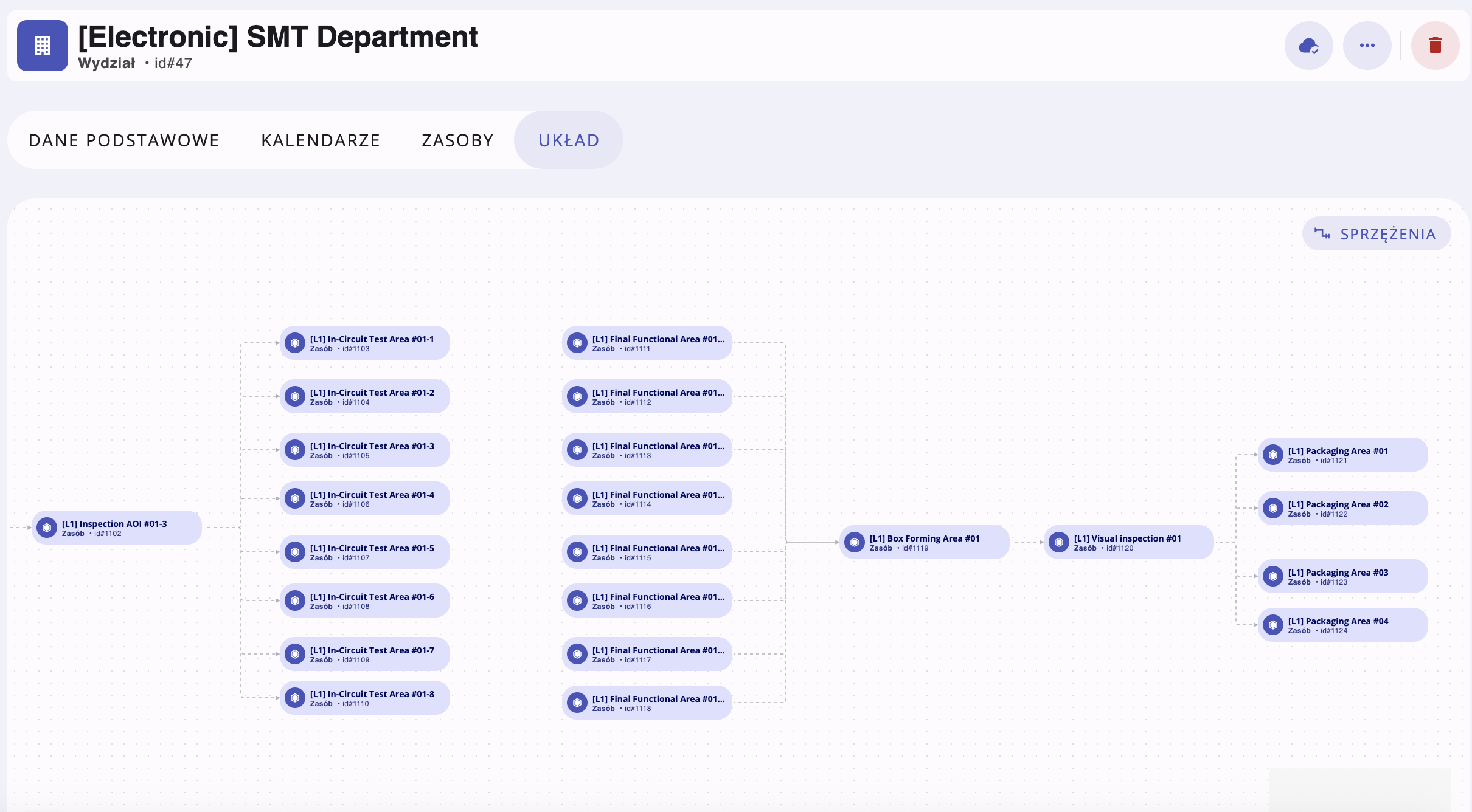 If you have selected resource A, you must select tool X or Y. This is a unique functionality that allows you to create dynamic resource selection rules. It can be used for operators. For example, if an employee is at work for the first time, automatically assign him a leader, i.e. an employee with high competences who will train him for 15 minutes. One-time or cyclical operation.