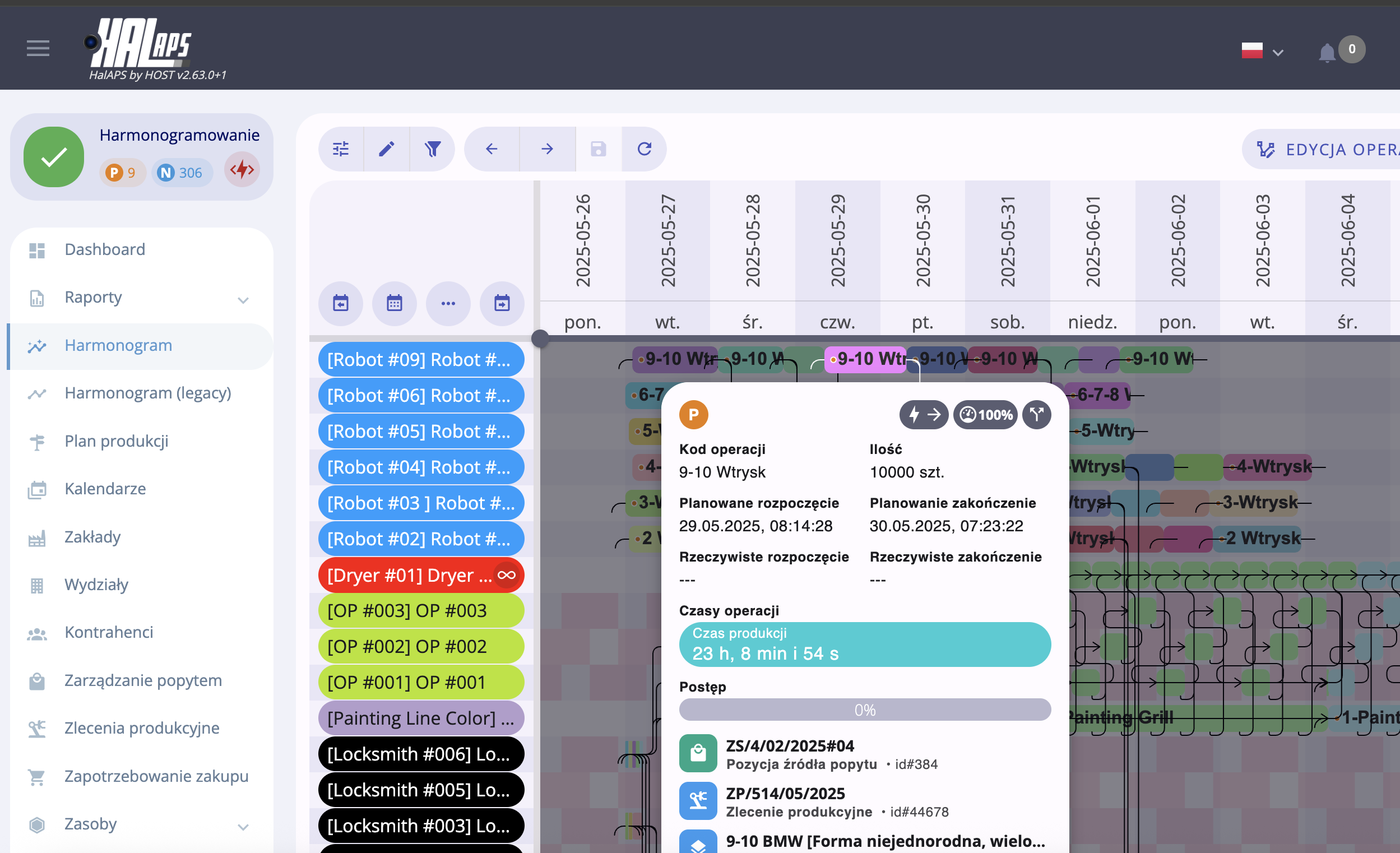 You can observe the production progress in real time. HAL enables the presentation of production progress in a Gantt chart, as well as in a tabular form. Production progress is information that HAL is fed with from the MES, SCADA, OPC or ERP server.